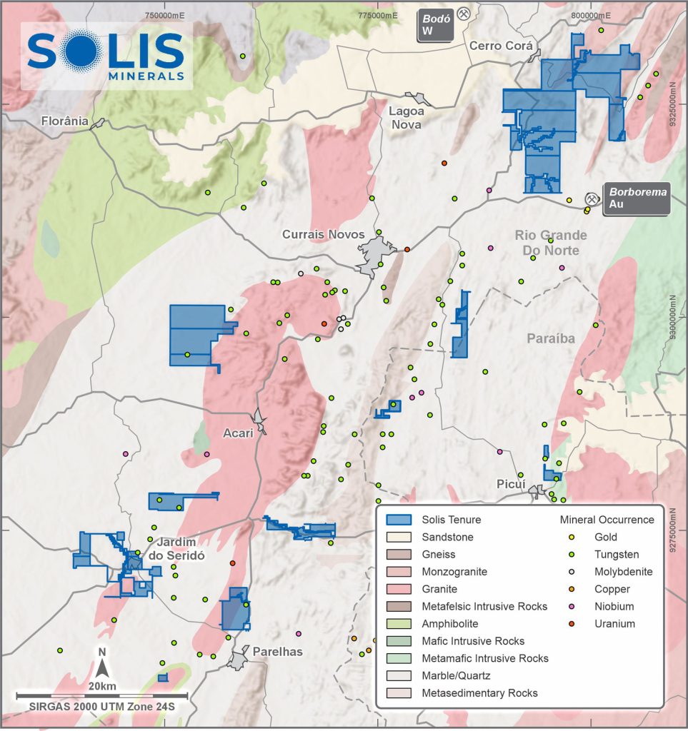 Solis Minerals holds 21,705 hectares of mineral concessions in the area of Borborema within Rio Grande do Norte, Brazil. The mineral-rich region has seen minimal modern exploration efforts, presenting a compelling opportunity for Solis Minerals.
