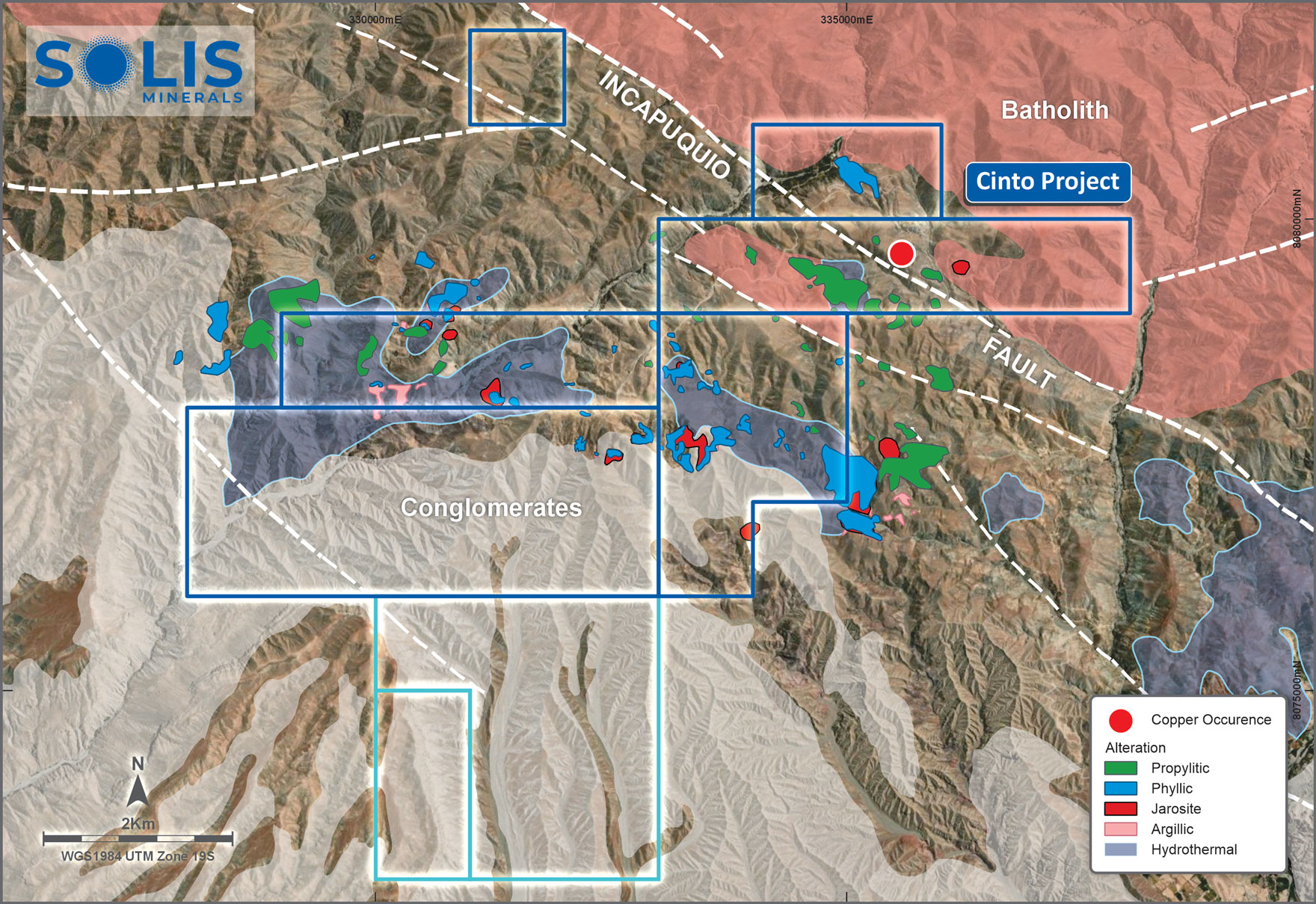 Local geology of the project is dominated by the Incapuquio fault system in the north-west that juxtaposes Cretaceous batholith rocks to the north against coeval volcanosedimentary shales, lavas and tuffs to the south. Splays and parallel structures cross the permits in the south. A zone of hydrothermal alteration crosses the centre of the permits. In late 2022, Solis carried out Worldview-3 satellite imaging and identified several distinct zones of alteration. The south of the permits are covered by the edge of the Oligocene basin with shallow to moderate thicknesses of conglomerates. The altered rocks extend beneath this cover and are considered valid exploration targets