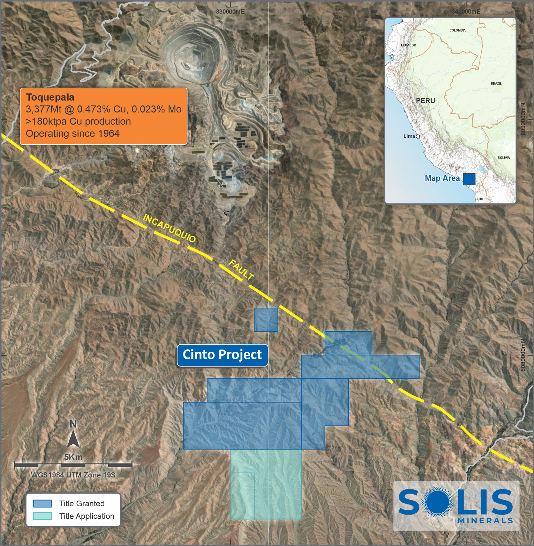 Late Cretaceous-Early Palaeogene intrusions related to the formation of major porphyries (Cuajone, Quellaveco, Toquepala) were probably favoured by the transcurrent nature of the Incapuquio fault and the zone and its margins form a focus of mining and exploration in southern Peru. The Cinto Project is situated in Toquepala Group volcanic and volcanosedimentary rocks which are coeval (same period) as the intrusives in the area and host the Toquepala porphyry.